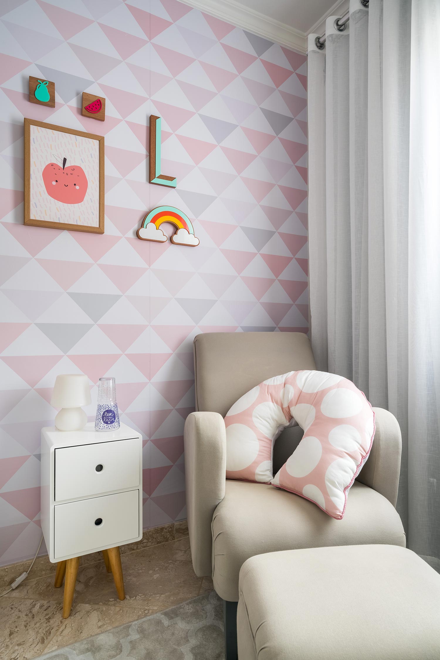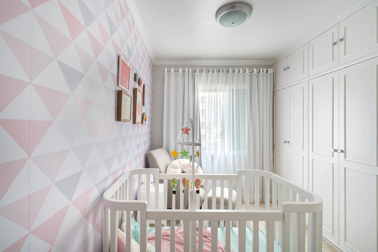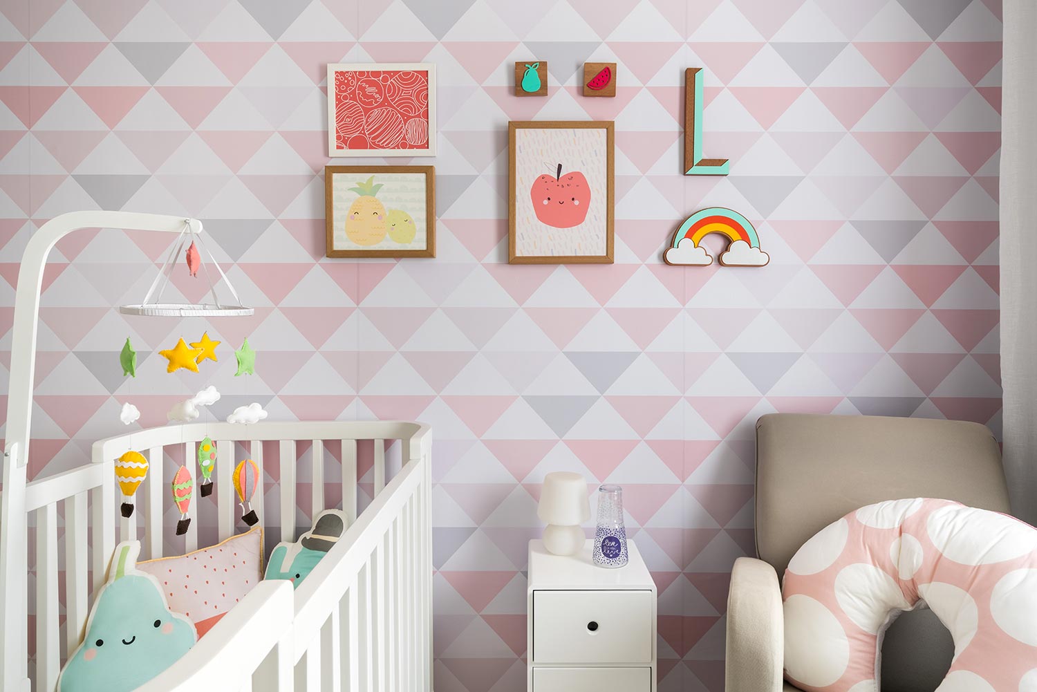 Fugimos um pouco do tradicional rosa, mas, mesmo assim ficou super delicado! Não fizemos nenhuma alteração estrutural, apenas colocamos esse adesivo vinilico na parede (quando eles fossem sair do apartamento, é só tirar o adesivo e re-pintar).