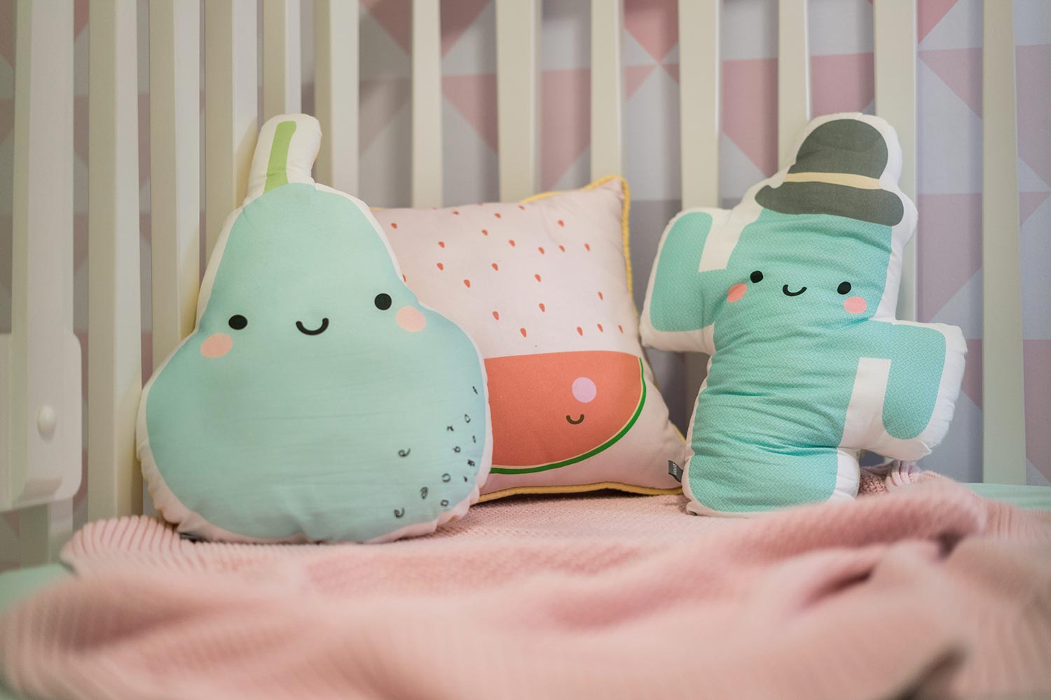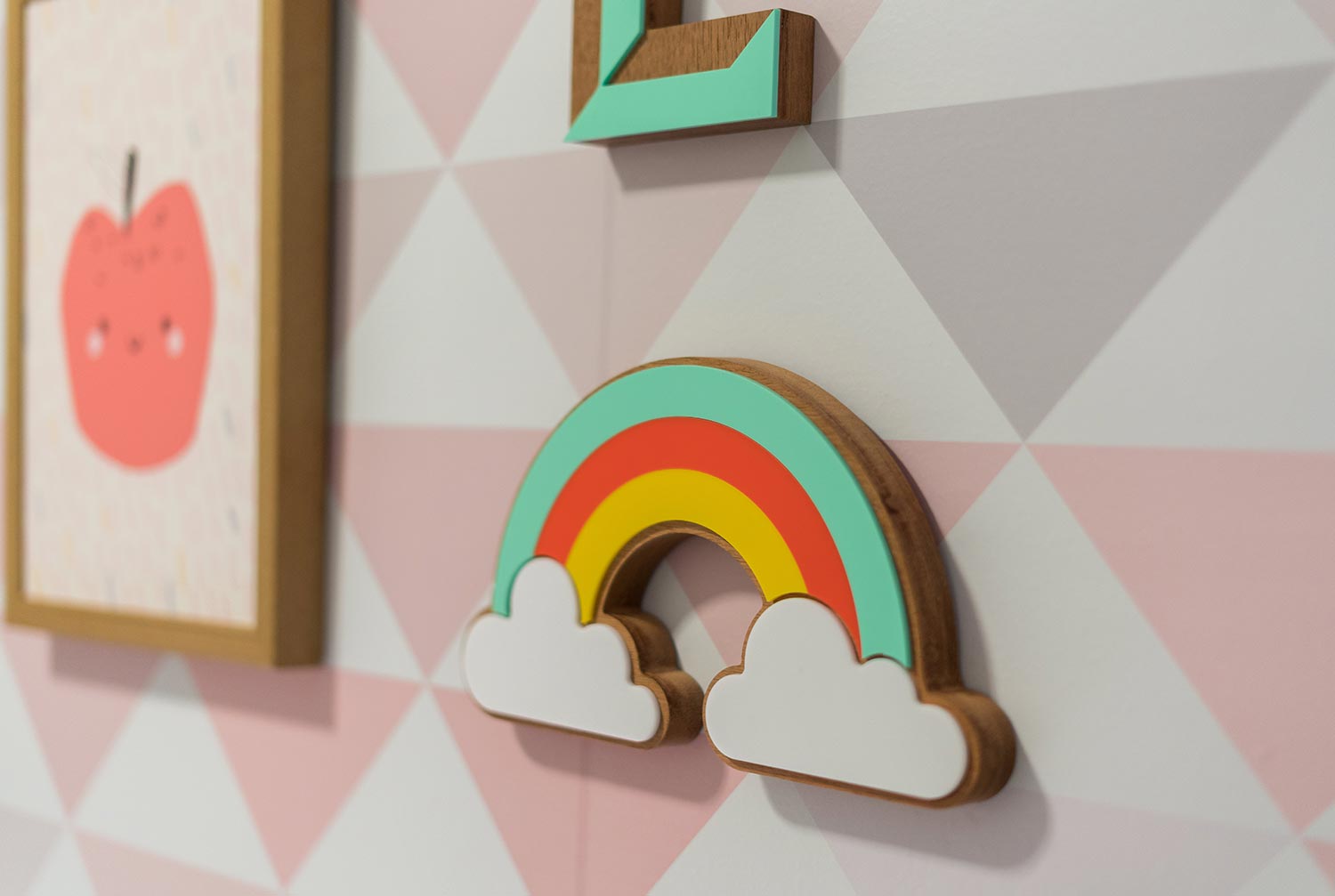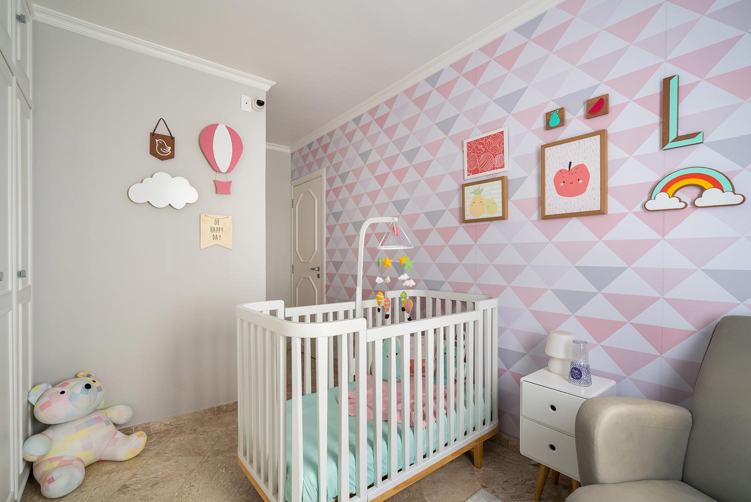 Fugimos um pouco do tradicional rosa, mas, mesmo assim ficou super delicado! Não fizemos nenhuma alteração estrutural, apenas colocamos esse adesivo vinilico na parede (quando eles fossem sair do apartamento, é só tirar o adesivo e re-pintar).
