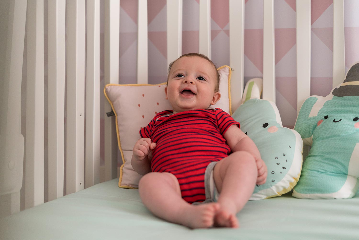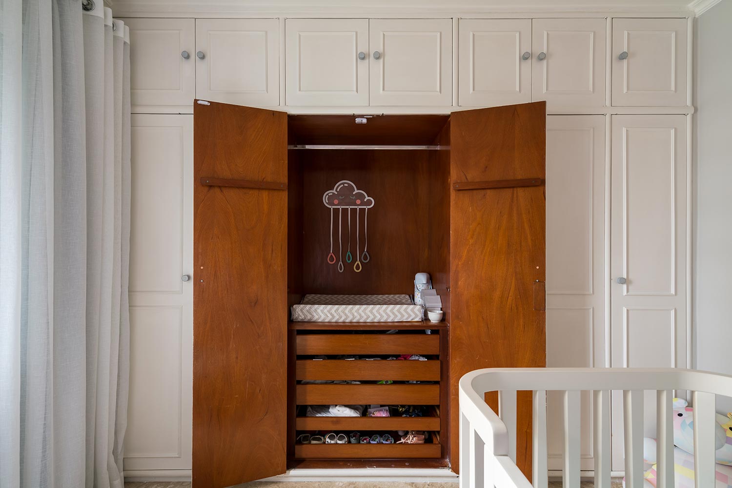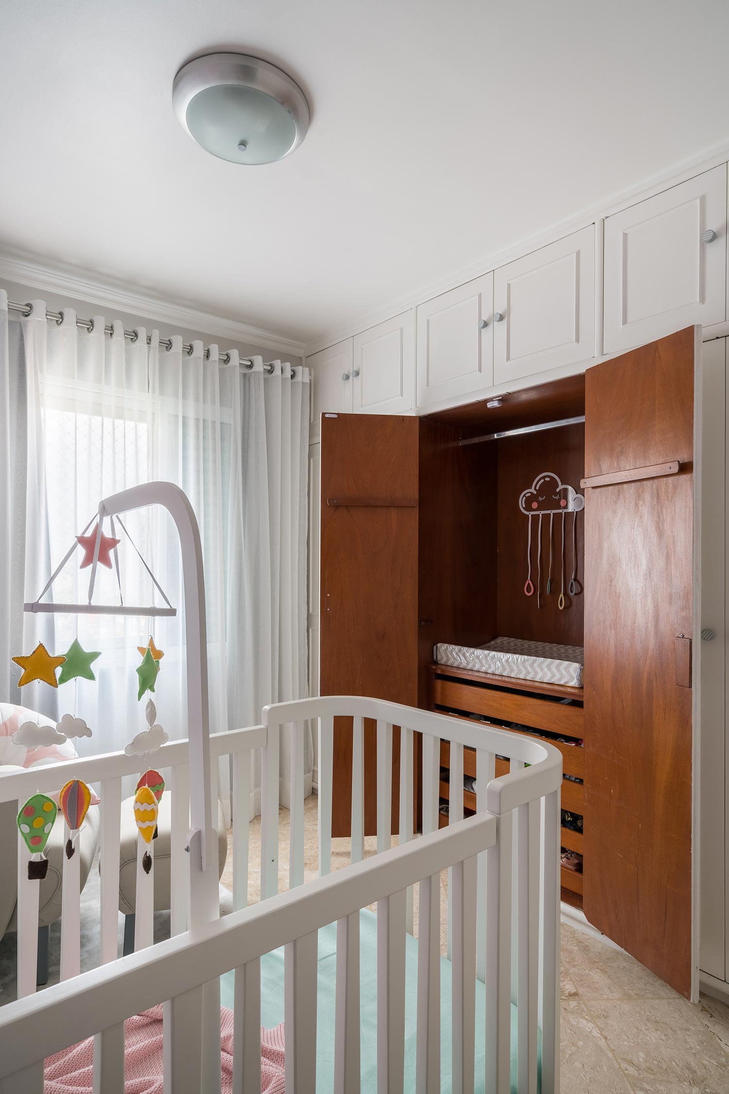 A maior “dificuldade” dele foi o fato do apartamento ser alugado: o armário do quarto é enoooorme, o que é ótimo, mas, fazia com que a opção de colocar uma cômoda/trocador deixasse o quarto apertado. Por causa disso, decidimos colocar o trocador dentro do armário! Isso liberou bastante espaço para circulação (de carrinho, inclusive) e para ela brincar, quando crescesse um pouquinho!